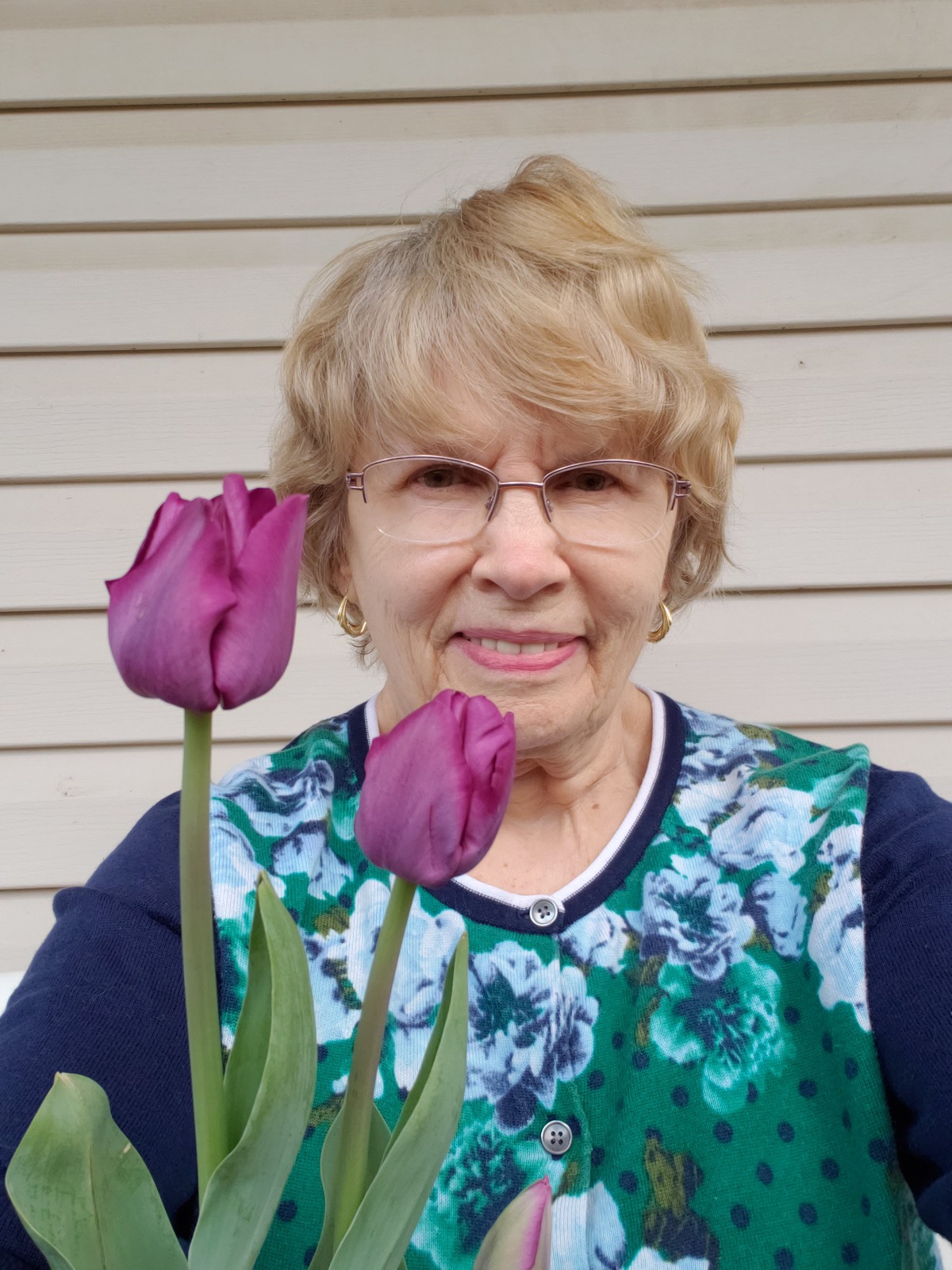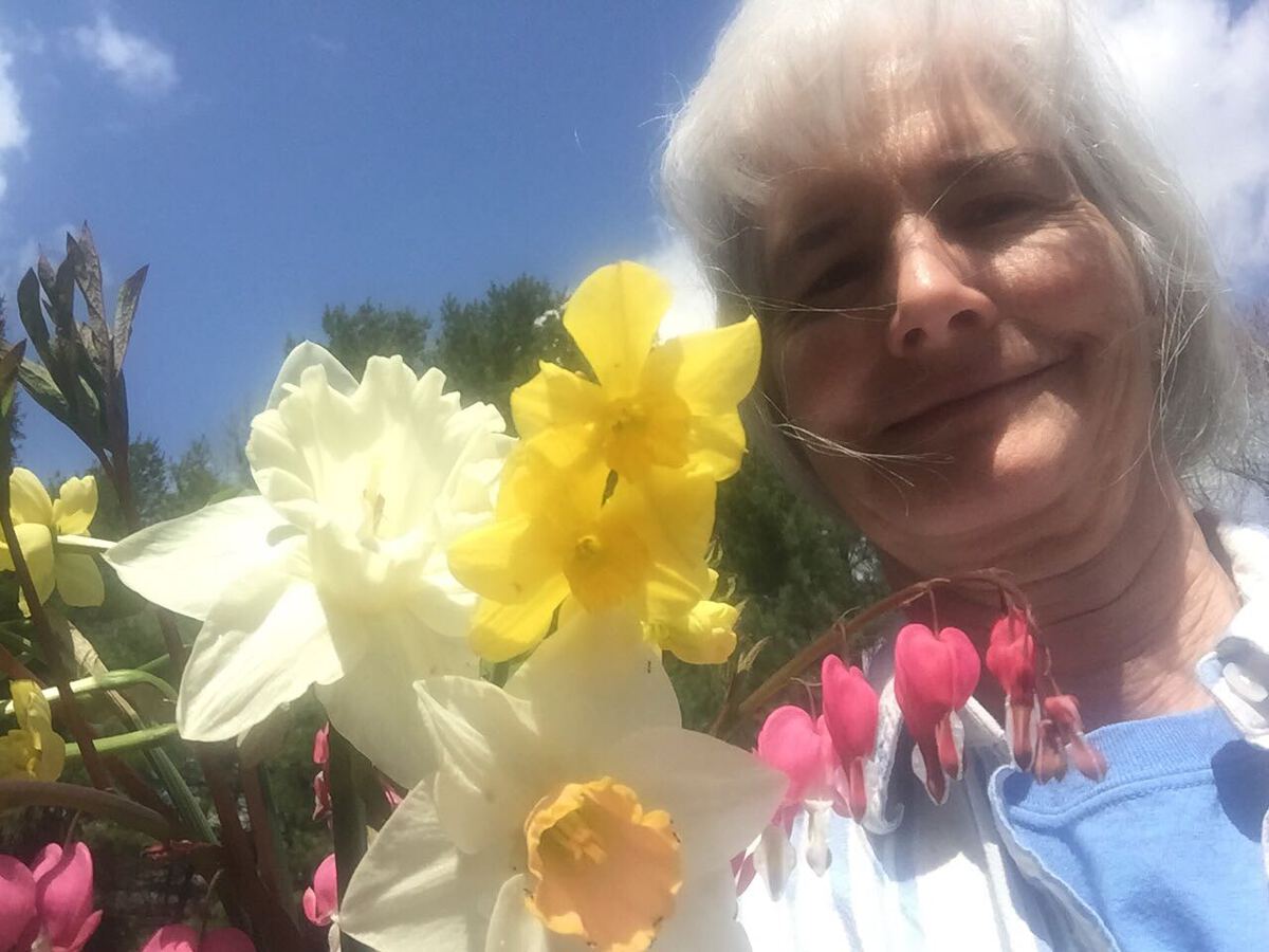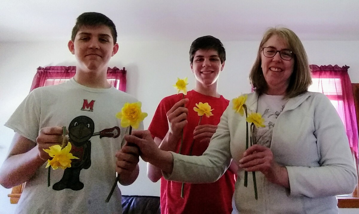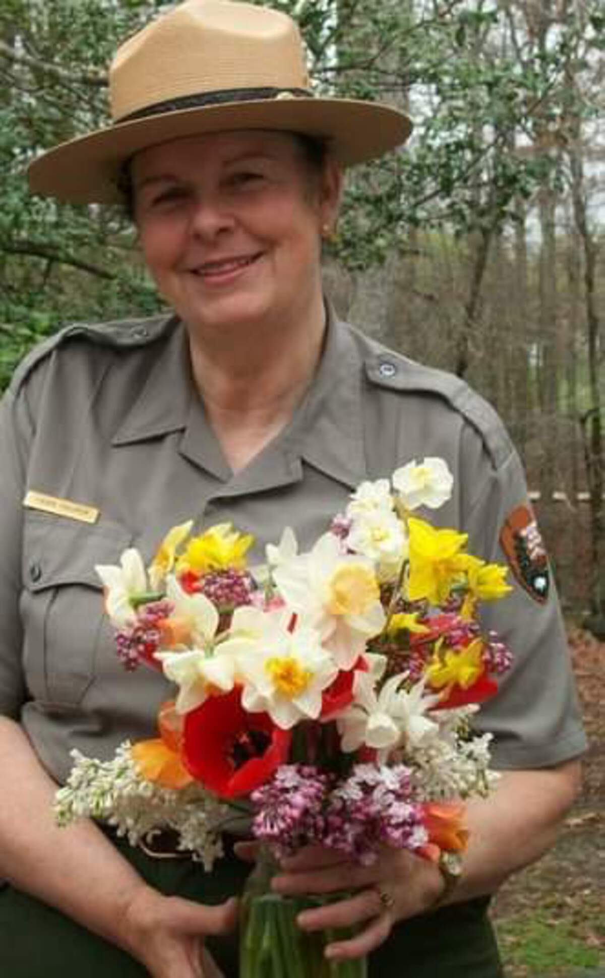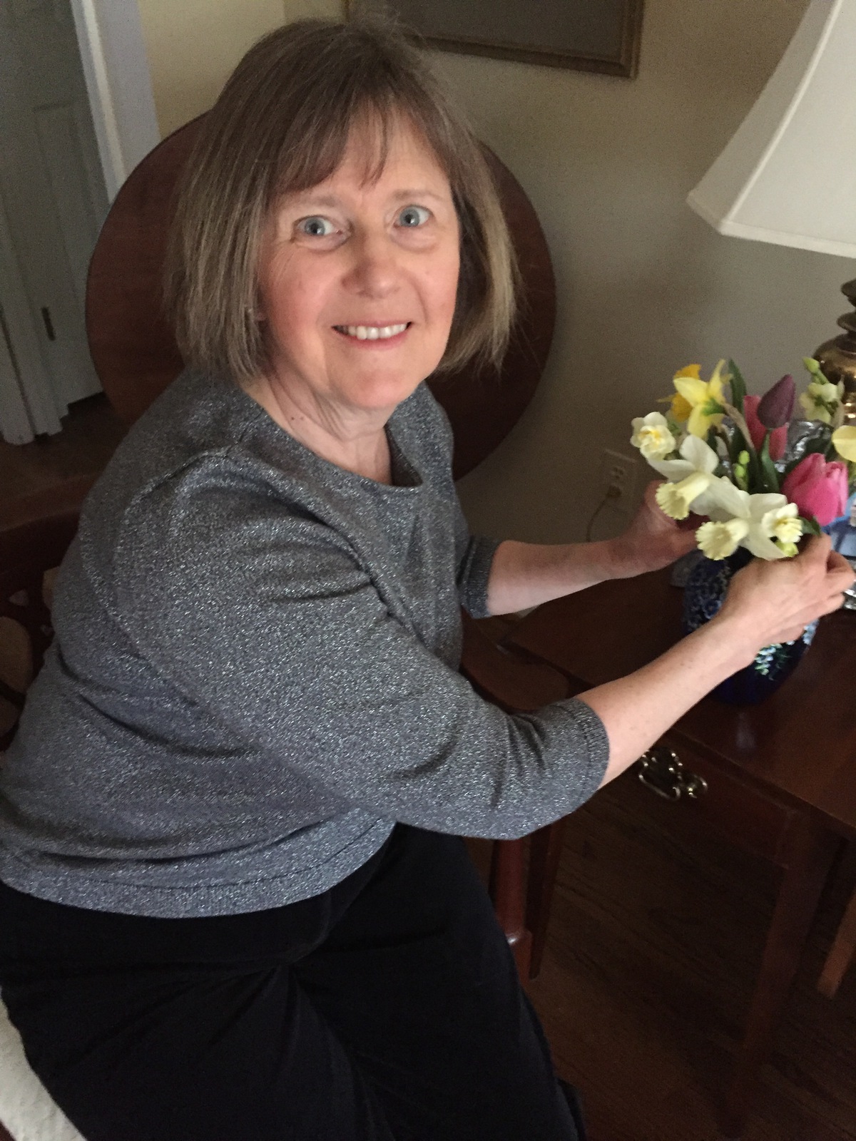 Pictures of folks holding spring flowers for Easter.