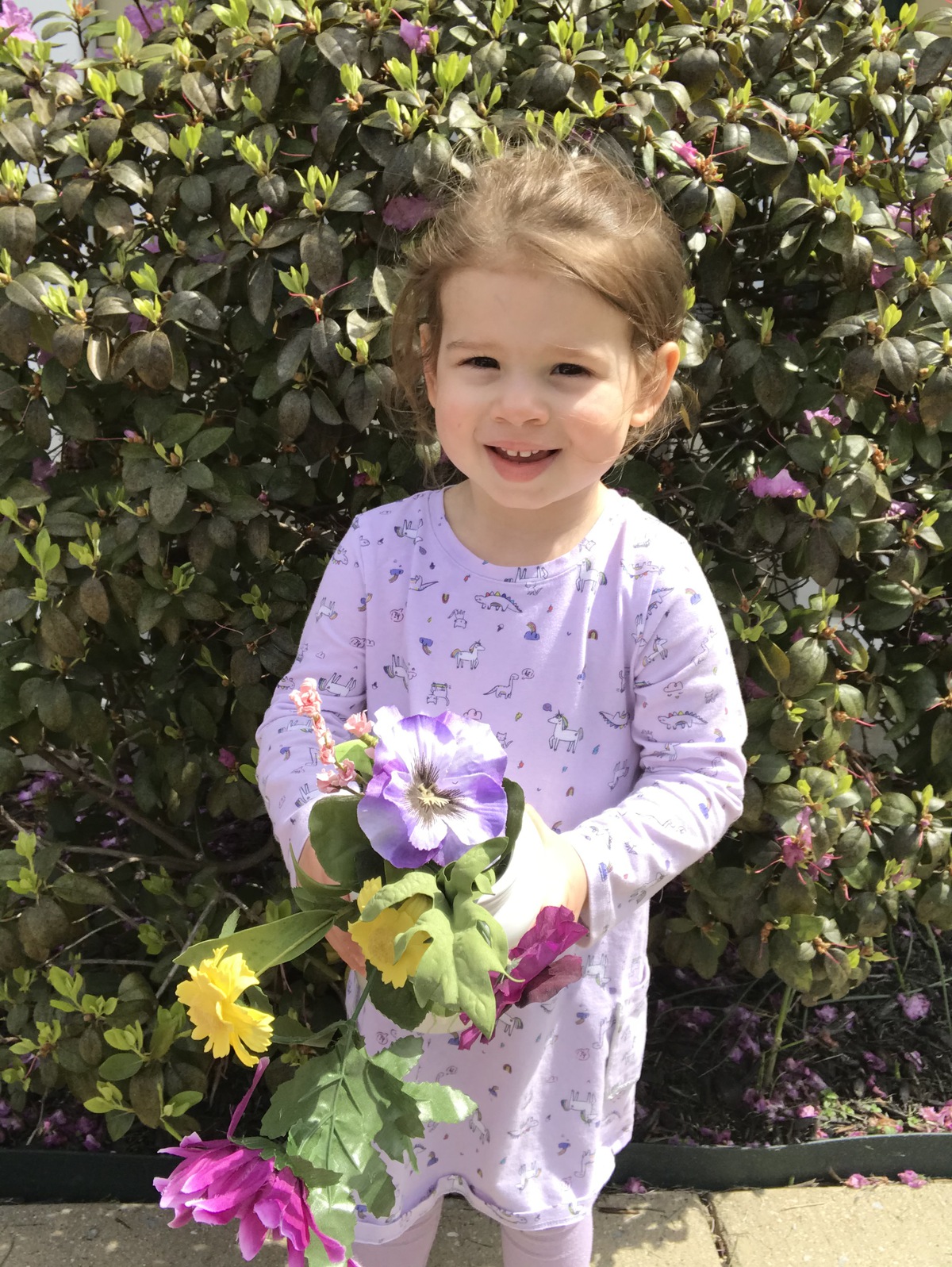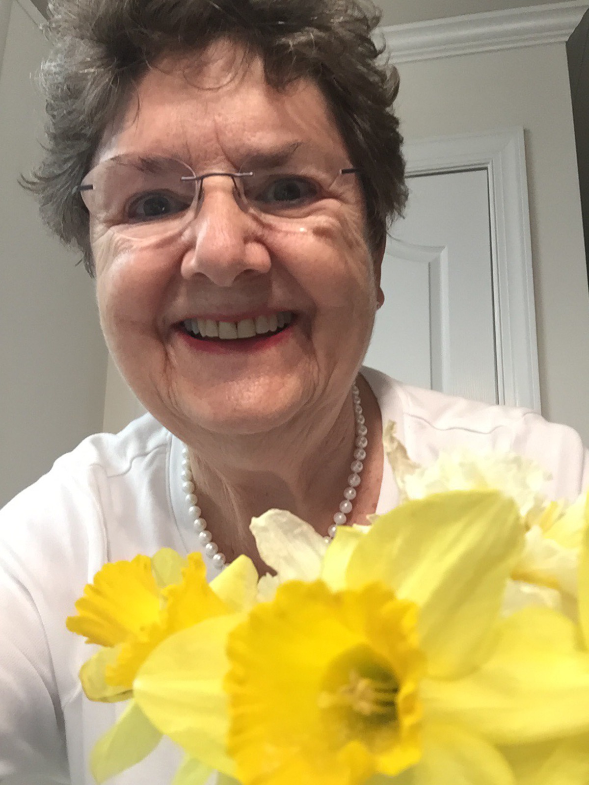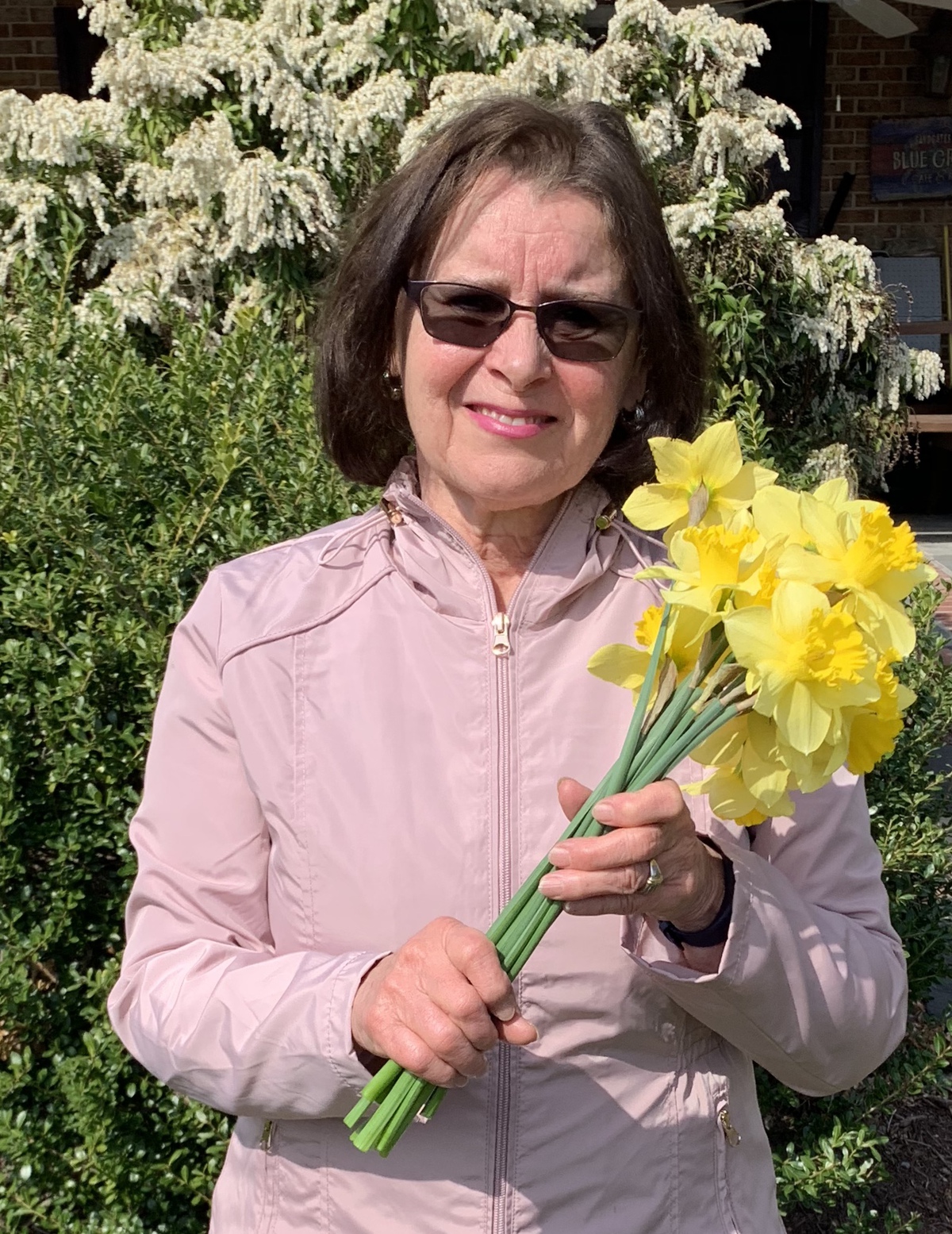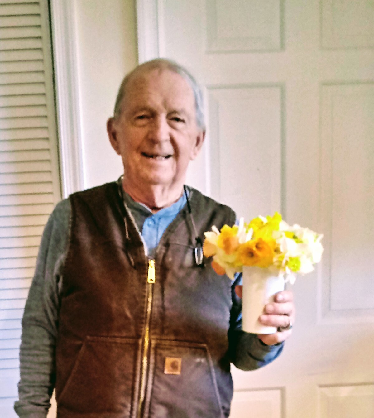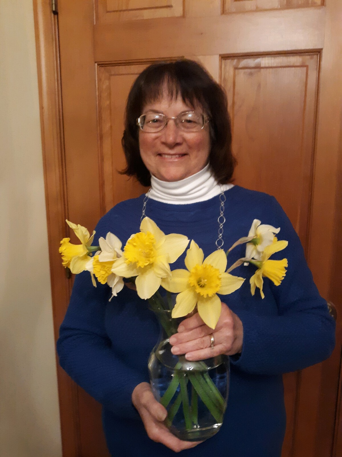 Pictures of folks holding spring flowers for Easter.