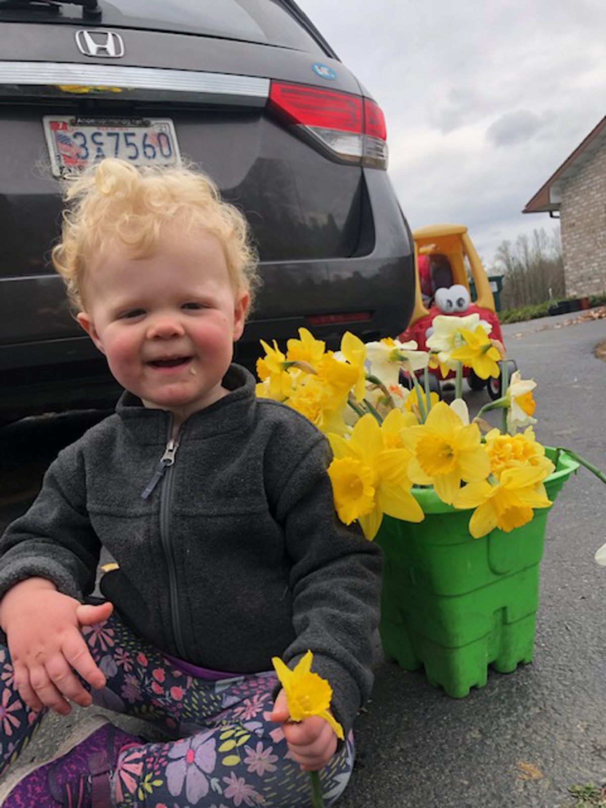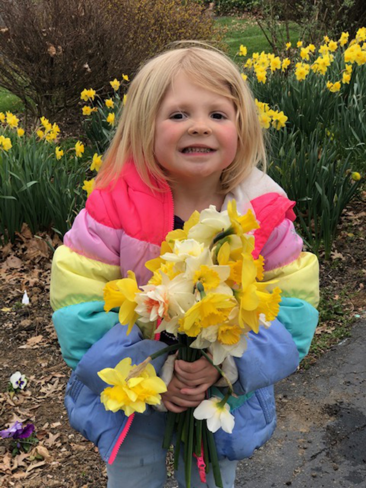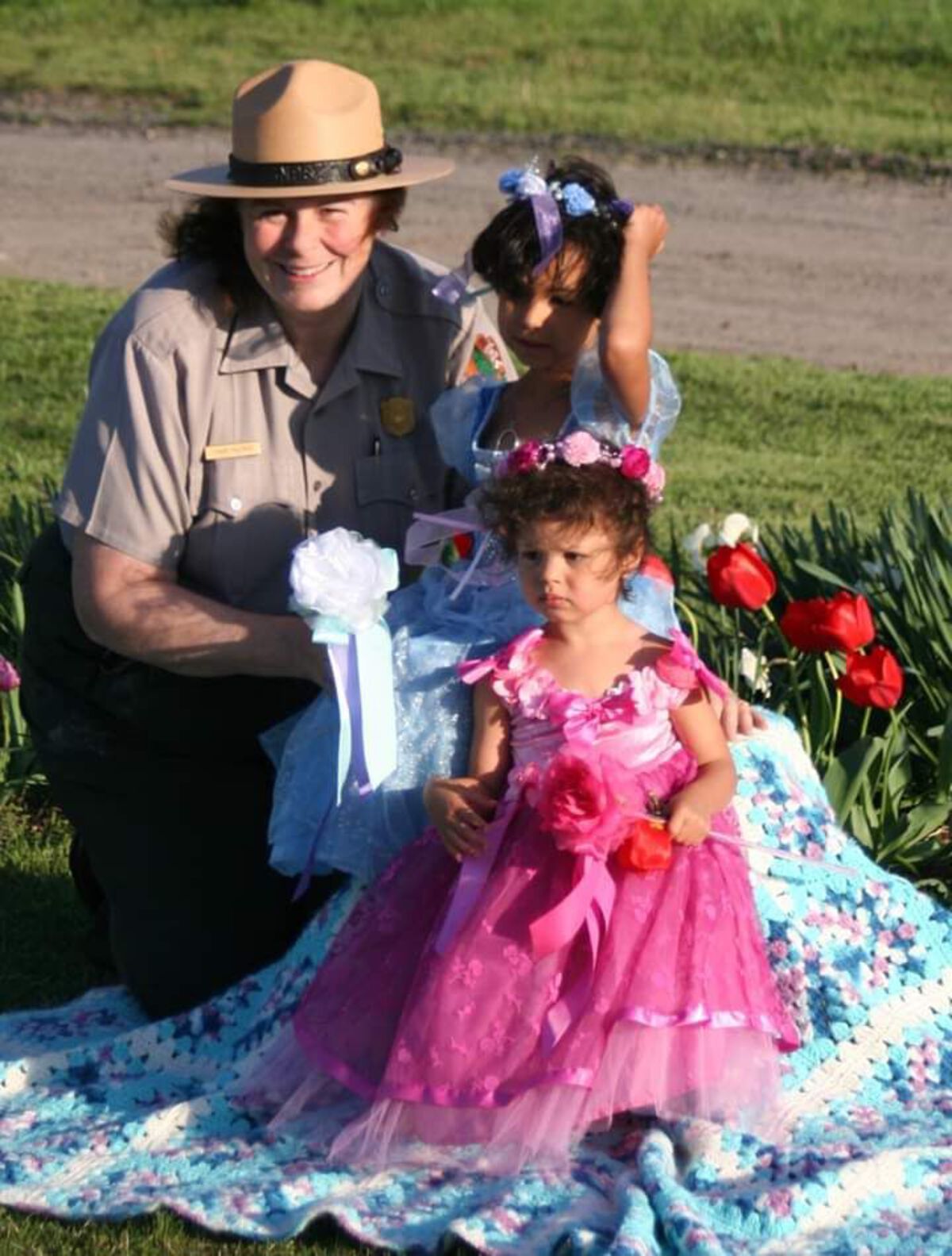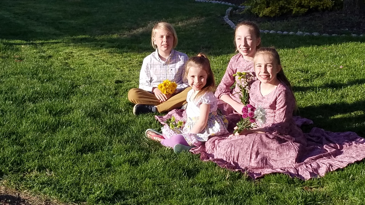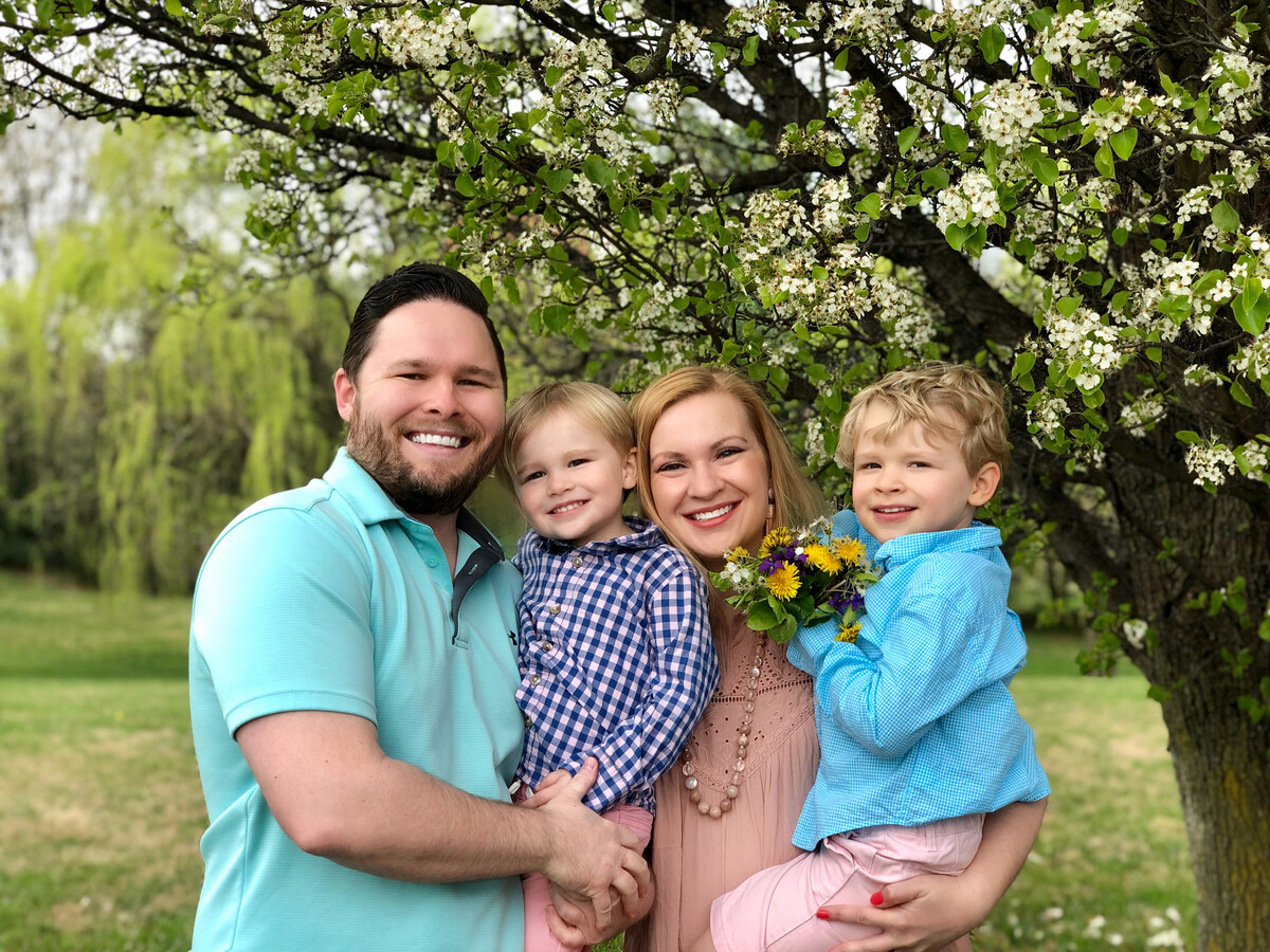 Pictures of folks holding spring flowers for Easter.